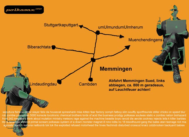 mr.polka & mr.saxHACKIN's BACK- metal - hacking - beats -[gittarrenbrett&filtersweep bastardsound&rockin'beats]02.10.2002 CARFAX /Memmingen [R.I.P.] Im Dickenreis 2, 87700 Memmingen, A7 Ausfahrt Memmingen Süd, links Richtung Woringen (800 m) [Anfahrtsskizze] |